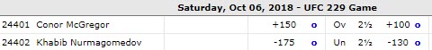 Click on ‘Sports’ from the top navigation bar of the BetOnline website, open the ‘Other Sports’ drop down menu and select ‘Martial Arts’ -> ‘MMA’.  The betting lines for all of the UFC 229 fights, including Conor McGregor vs Khabib Nurmagomedov will be shown under the ‘Oct 06 – UFC 229’ header.  Here’s a look at the McGregor vs Khabib UFC 229 odds at the time of this article (October 5th):